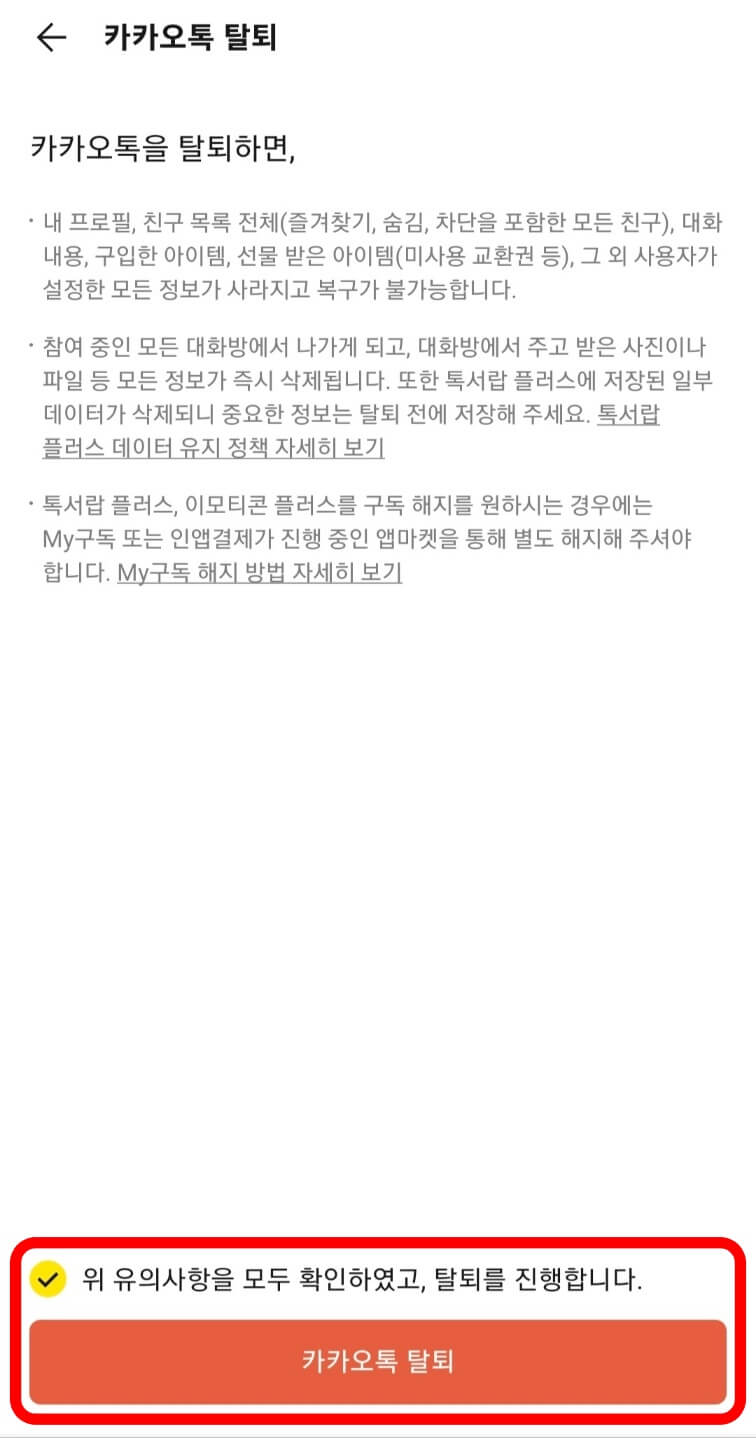 유의사항을 모두 확인했다면 하단에 체크 하고 [카카오톡 탈퇴]를 누르면 탈퇴가 완료됩니다.