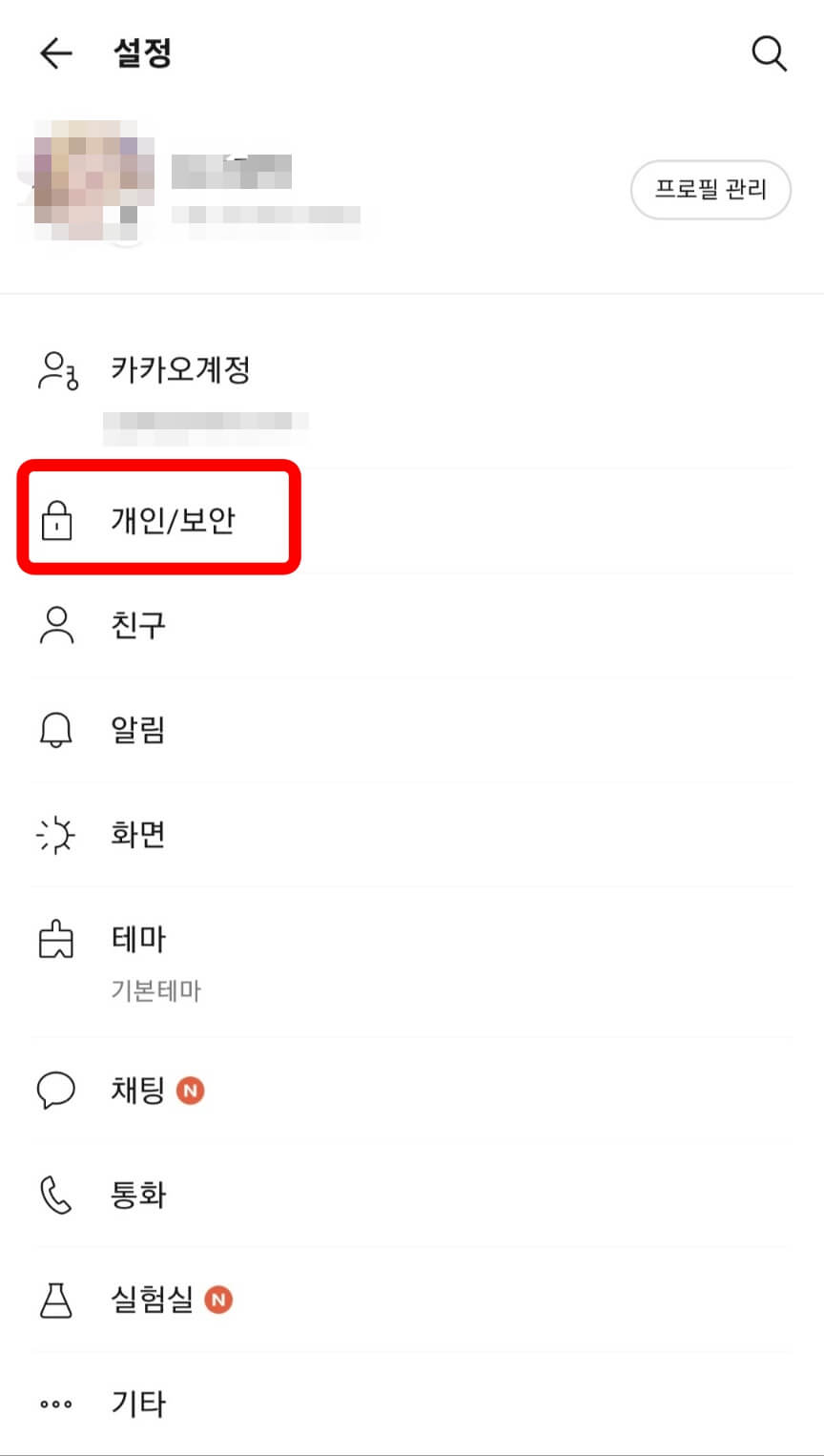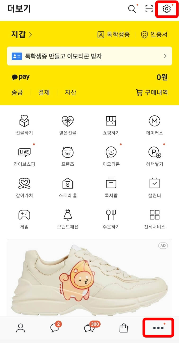 1. 카카오톡 실행 - 오른쪽 하단(...) 더 보기 - 오른쪽 상단 톱니바퀴 모양 선택